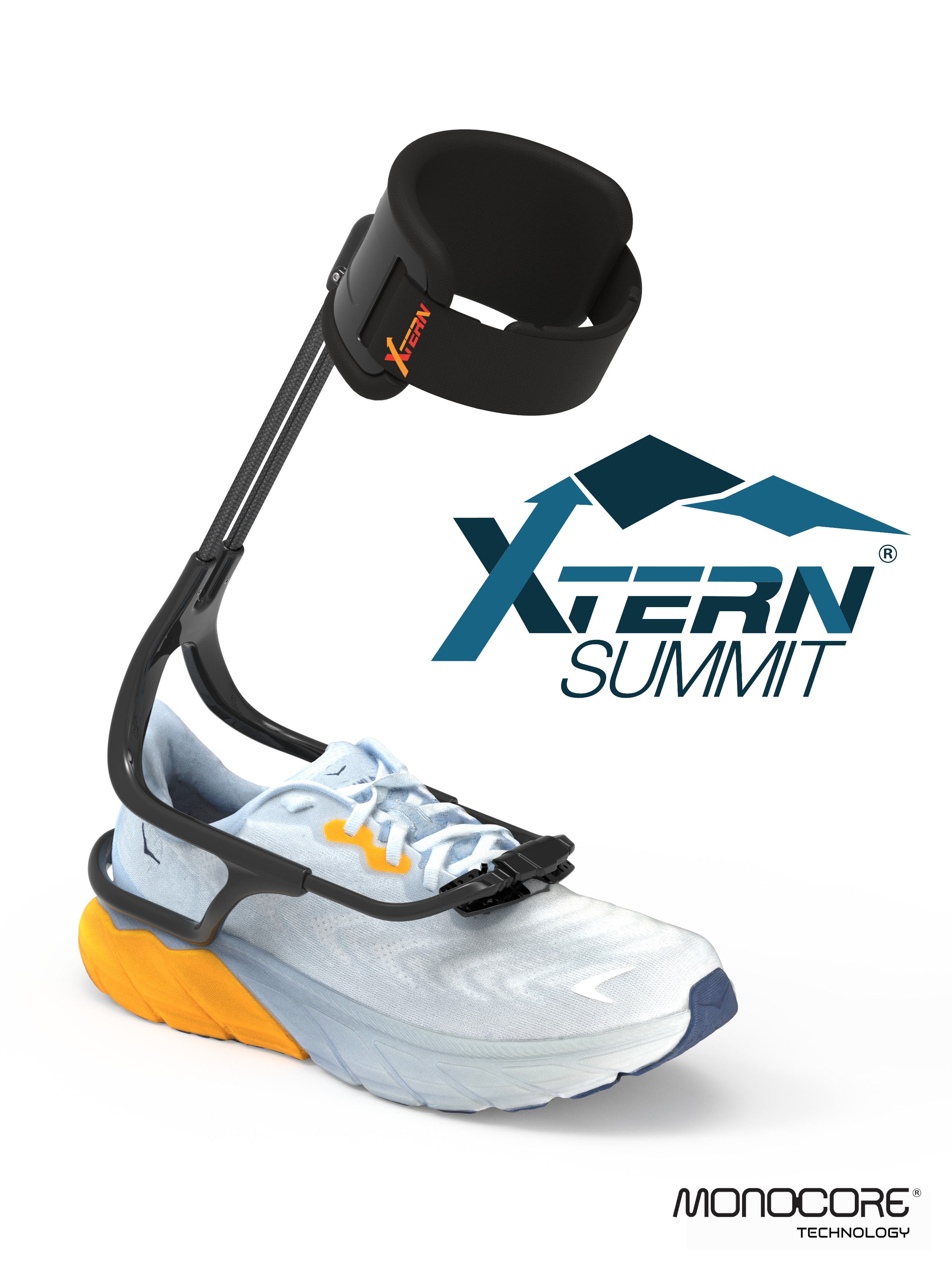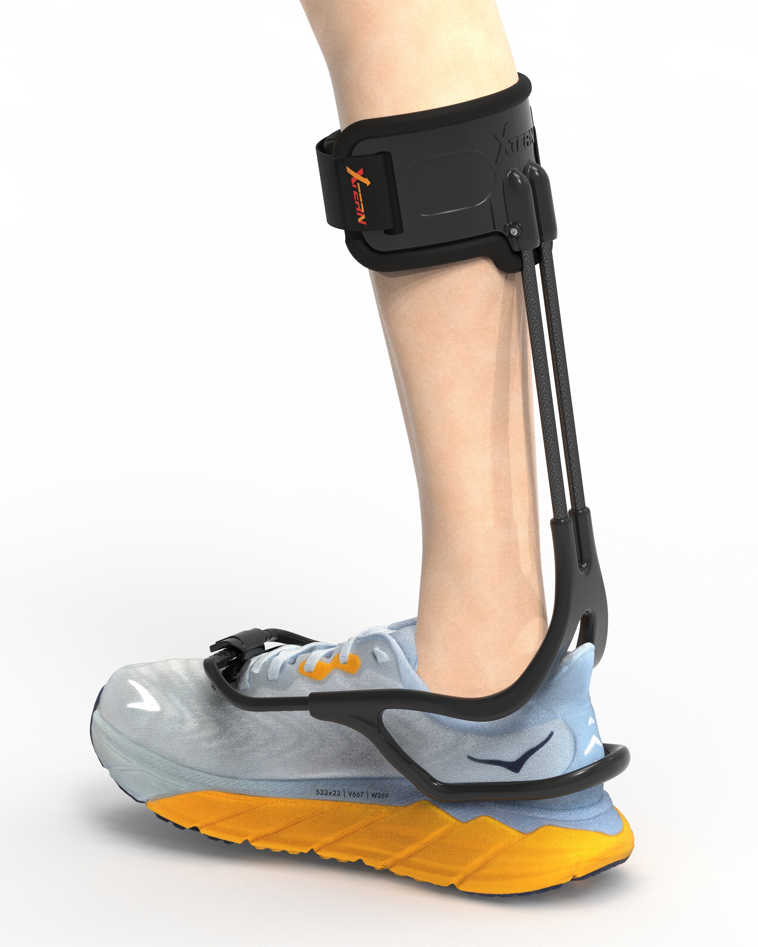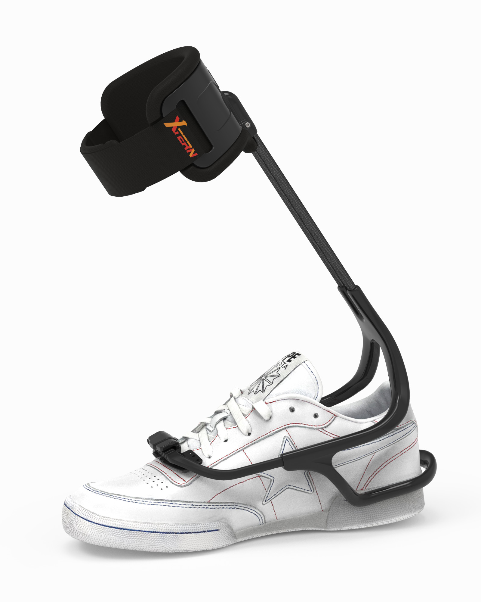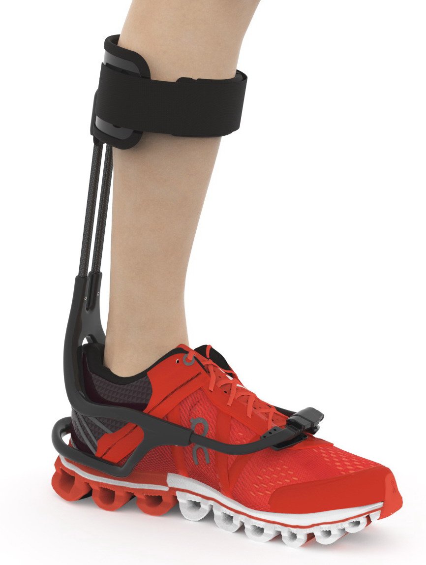 AFO for foot drop anterior model; 100% dynamic, 100% outside the shoe. Goes from shoe to shoe in only 5 seconds! NO skin contact, NO bigger shoes, NO more blist...