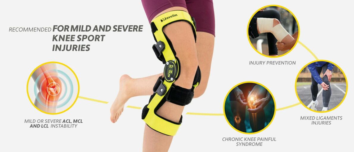 JAVELIN functional knee brace provides support to the knee joint after an injury and prevent injury from occurring. Typically, a knee injury occurs as a result of excessive physical exertion (e.g. intense running, bad form when lifting weights, overexertion, etc.) or contact sports such as football.